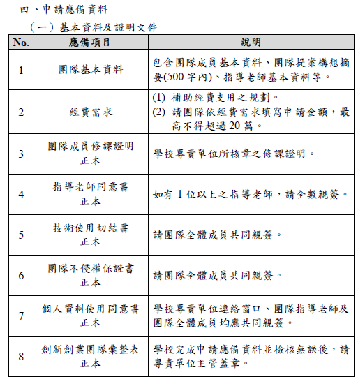 (一)以「校」為單位提出申請,創業團隊應修習校內所開設之創新創業相