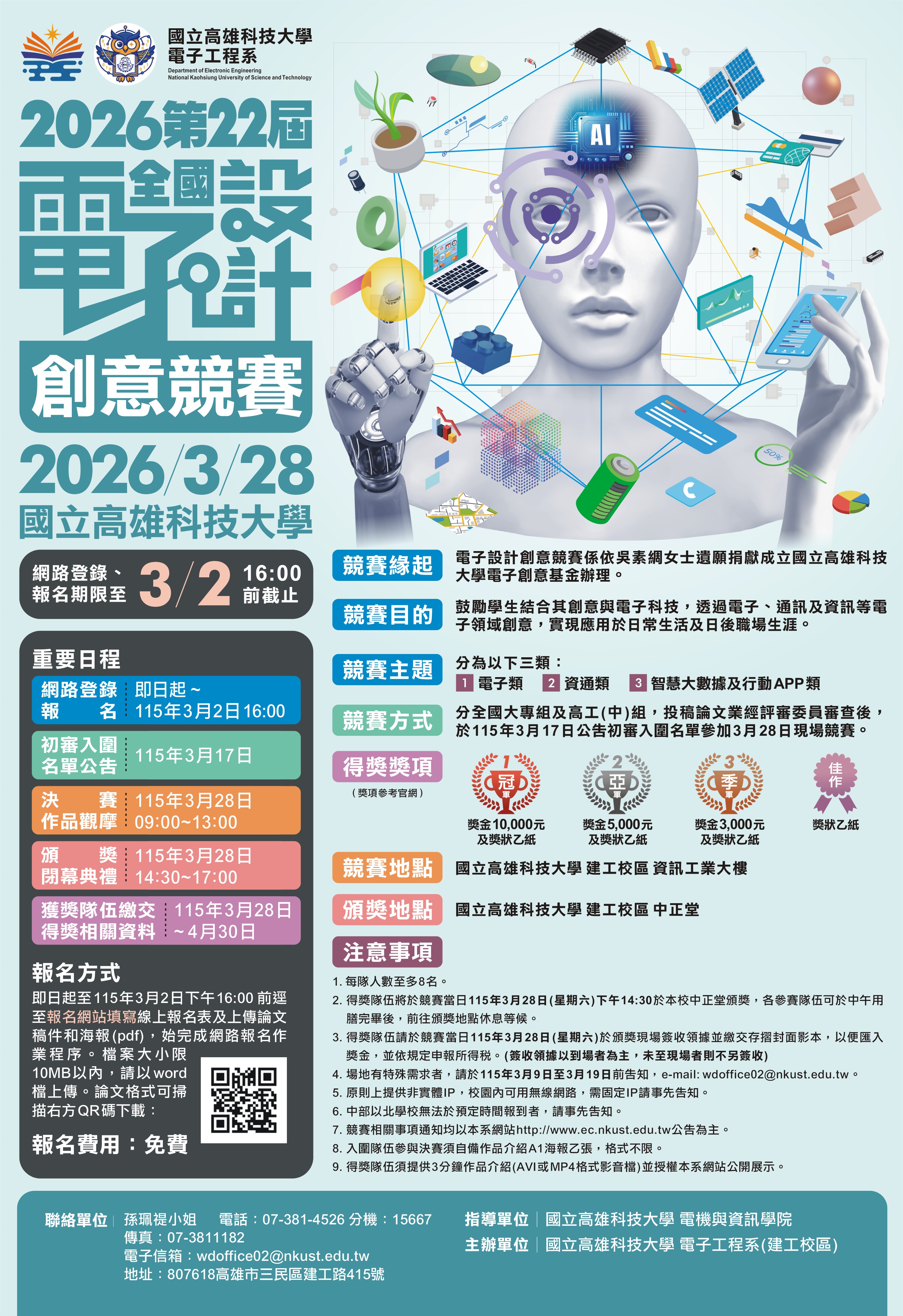 【競賽】國立高雄科技大學-2026年第二十二屆全國電子設計創意競賽