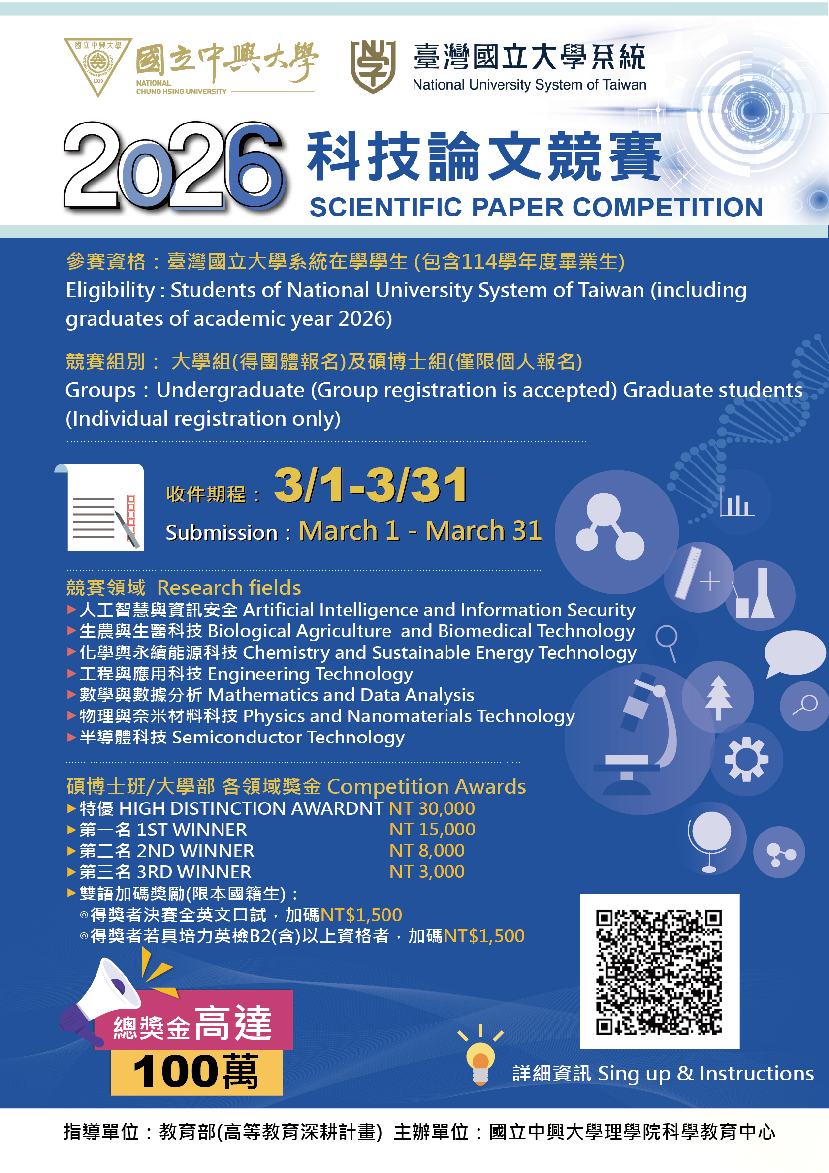 二、敬邀臺灣國立大學系統師生踴躍參與科技論文競賽,總獎金高達100萬元。